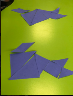 LS2 and lS1 were collaborate to make a Tangrams is an agent Chinese puzzle that were used on the boat in the days . We started with paper and a pears of swers Were were listening to instructions .We were cuting out the shape and problem solving to make the shape like animals and a square.